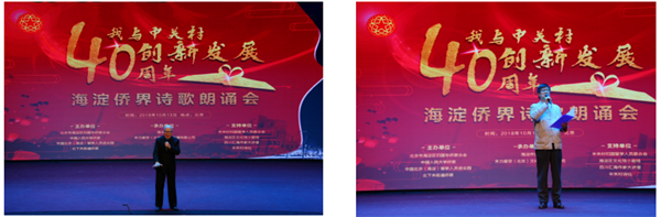 10月13日,“我与中关村创新发展40周年”海淀侨界诗歌朗诵会在海淀区文化馆小剧场成功举办,200余名侨界群众、海创人才、演职人员欢聚一堂共庆中国改革开放40周年和中关村创新发展40周年。