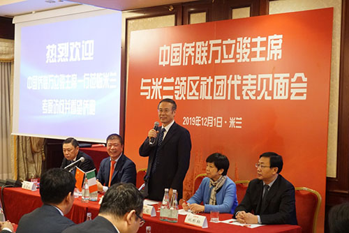 (意大利当地时间)2019年12月1日至5日,中国侨联主席万立骏率代表团访问意大利,出席中国侨联欧洲地区海外委员座谈会,深入米兰、佛罗伦萨、普拉托、罗马,走访侨社、看望侨胞、了解侨情,宣讲党的十九届四中全会精神,介绍国内经济社会发展和侨联工作情况,听取旅欧侨胞有关工作意见和建议,更好地聚侨心、集侨智、汇侨力。他表示,中欧关系是世界上最重要的双边关系之一,中国把欧洲放在对外关系的重要位置。面对当今世界百年未有之大变局,面对新时代中国改革发展的需要,广大旅欧侨胞要始终心系祖(籍)国,勇担历史使命,发扬侨界传统,发挥自身优势,做爱祖(籍)国、爱社会主义的先行者,中华文明的传承传播者,实现中华民族伟大复兴、构建人类命运共同体的推动者,中欧友谊的民间使者,坚持“一国两制”、推进祖(籍)国统一的奋斗者,不断学习、不断创新、团结向上的实践者。