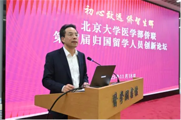 王军为代表北京大学医学部党委对论坛的举办表示祝贺,对中国侨联、北京市侨联及海淀区侨联长期以来的指导与支持致以衷心谢意。归国留学人员创新论坛是医学部侨联的品牌活动,为广大归国留学人员搭建起建功新时代、展现新作为的重要平台。希望医学部归侨侨眷和归国留学人员全面贯彻落实二十届四中全会关于教育改革发展的新部署新要求,以落实立德树人根本任务为统领,充分发挥自身优势,勇踊跃投身科技创新的浪潮,为推动中国式现代化的北医新实践贡献智慧和力量。